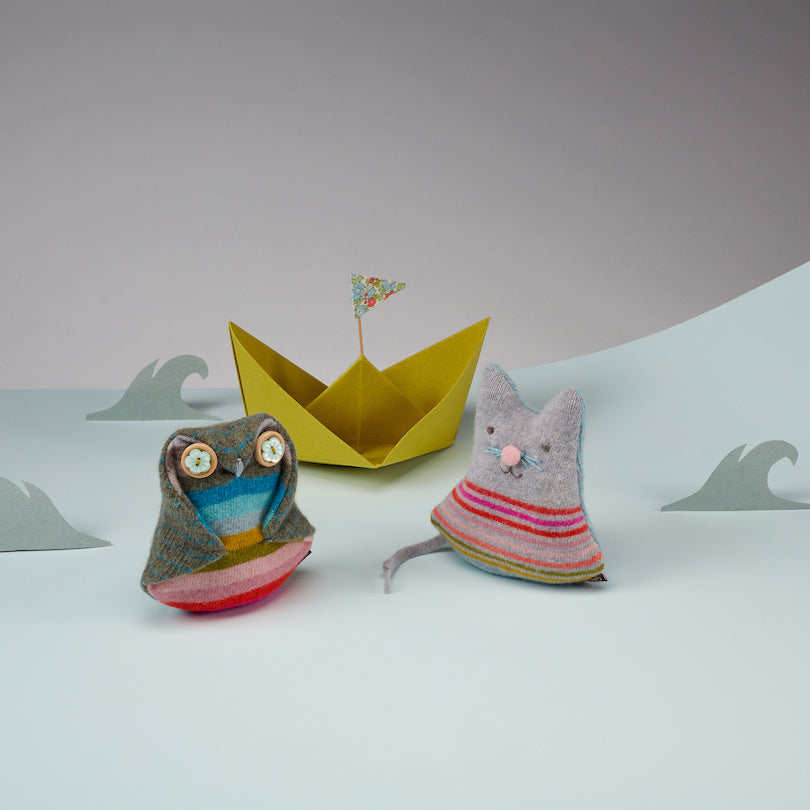 Cat shaped Norfolk lavender blossom filled pocket with striped chest and forget-me-not blue, textured knit fine stripe 'fur'. Comes with a presentation gift box, pink button nose detail and hand embroidered eyes, mouth and whiskers.